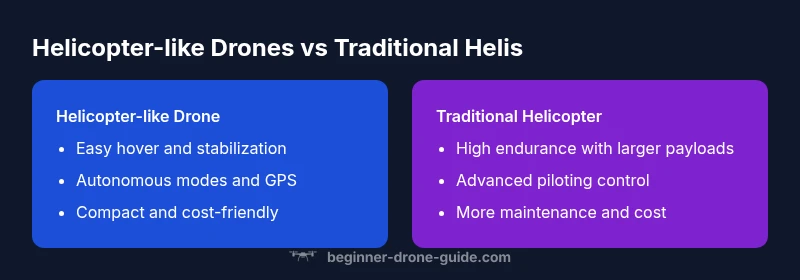 In drone jargon, a 'drone like helicopter' refers to rotorcraft drones that emulate helicopter-style flight while keeping the learning curve friendly for newcomers. These machines use multiple rotors to achieve vertical takeoff, stable hover, and agile maneuvering, all under computer-guided stabilization. For many buyers, this category emphasizes automatic flight modes, GPS stabilization, and safety features that simplify learning. According to Beginner Drone Guide, the term captures a category where accessibility, safety features, and intuitive controls are prioritized over raw speed or long endurance. A well-chosen helicopter-like drone typically includes GPS-based position hold, return-to-home, obstacle sensing, and automatic takeoff/landing. These features help beginners focus on framing shots and basic piloting, rather than wrestling with instinctive stick movements. The key is choosing a model that balances ease of use with upgrade options, so new pilots can progress without outgrowing the platform quickly. By starting with stabilized drones, you gain confidence, learn boundaries, and build a foundation for more advanced flight disciplines.