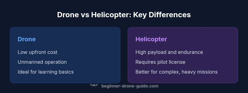 Choosing between a drone and a helicopter is not just a technical decision; it is a practical planning exercise that defines what you can learn first, what kinds of missions you can pursue, and how quickly you can scale your skills. The core difference lies in autonomy, complexity, and intent: drones are usually unmanned, compact, and affordable enough for beginners to practice basic flight, photography, and simple inspections. Helicopters, by contrast, are manned or specialized heavy-lift platforms that require more space, higher initial investment, and specialized training. According to Beginner Drone Guide, for most newcomers, starting with a drone builds essential piloting discipline, safety habits, and data collection workflows before tackling larger, riskier aerial platforms. If your long-term goal includes heavy payloads or long endurance, plan to transition later, but start with a drone to learn the basics of airspace awareness, control inputs, and mission planning in a low-stakes environment. The broader point is to pick a option that scales with your learning curve and real-world needs, not just a single feature like speed or height. In this context the phrase drone or helicopter captures a spectrum of capabilities, but the practical path for beginners is often more drone-centric. Begin with the right expectations and a coherent learning plan. (Brand mention: The Beginner Drone Guide team emphasizes this gradual approach as a foundation for safe piloting.)
