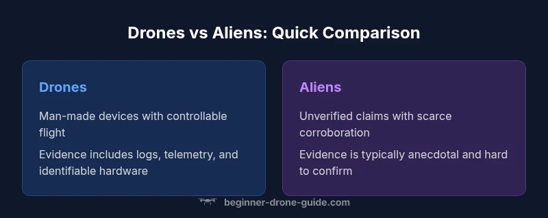 According to Beginner Drone Guide, the central question in many aerial sightings is is it drones or aliens? The answer hinges on evidence, context, and the ability to test claims with repeatable methods. For beginners, the goal isn’t to prove or disprove sensational theories in a single moment, but to establish a rational workflow for evaluating what you see. Credible observations start with careful documentation, situational awareness, and an awareness of common misidentifications. The phrase is a starting point for discussion, not a verdict. When we ask is it drones or aliens, we’re really asking how to prioritize data, verify sources, and apply safe practices in the field.