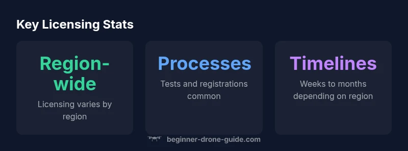 Licensing landscapes vary by region, with some countries centering requirements on knowledge tests and others on practical flight assessments. In the United States, commercial drone work traditionally relies on a remote pilot certificate, while recreational flyers typically follow rules that emphasize safe operation and DIY training. Across the UK and European Union, authorities often emphasize knowledge-based certificates, operator registrations, and airspace permissions. In other regions such as Canada, Australia, and parts of Asia, licensing bridges between knowledge exams, practical flight checks, and mandatory drone registration when applicable. For beginners, the pattern is clear: identify your use-case first, then consult your national aviation authority to determine the exact license type and any associated steps. Based on Beginner Drone Guide analysis, licensing rules differ by country and use-case, so a quick regional check is essential.
