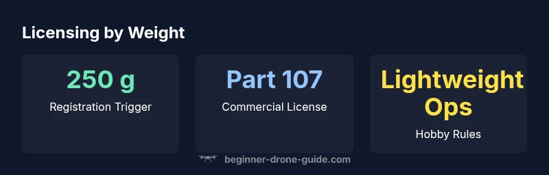 Bottom line: licensing depends on weight and use, not drone brand. In many regions, drones weighing 250 g (0.55 lb) or more require registration, and a license is commonly required for commercial operations. Drones under 250 g often avoid licensing, but you still must follow safety rules and local rules. Verify your local authority's current requirements before flying.