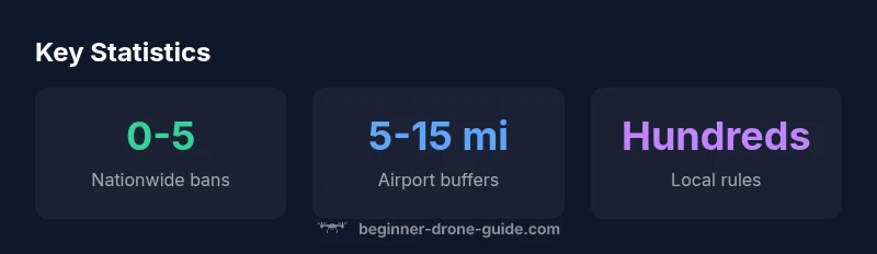 In everyday language, the phrase where drones are banned refers to areas with explicit prohibitions or safety restrictions on drone flights. According to Beginner Drone Guide, the most common bans are not nationwide prohibitions but location-based rules that restrict flights in certain zones such as near crowded venues, critical infrastructure, or sensitive government buildings. This section clarifies the spectrum of bans—from nationwide prohibitions to site-specific restrictions—and shows how to interpret them so you can fly safely and legally anywhere you operate. Understanding the scope of bans helps beginner pilots plan flights that stay within legal boundaries while still achieving their goals.