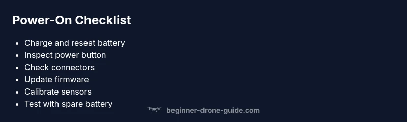 When you ask, "why is my drone not turning on?" the answer often lies in power basics, safety features, and simple hardware issues. According to Beginner Drone Guide, most power-on failures are preventable with a methodical check of battery health, seating, and the boot sequence. A drone may fail to boot if the battery can’t deliver adequate current, the safety switch is engaged, or firmware is in a rare fault state. Temperature, age, and previous crashes can also influence boot behavior. By understanding these common culprits, you can diagnose quickly and avoid unnecessary guesswork. This section sets the stage for a practical, safety-focused troubleshooting flow and establishes that most fixes are accessible to beginners with common tools. Remember, always prioritize safety and follow local regulations when handling power systems. The Beginner Drone Guide team notes that many beginners struggle to power on due to batteries, connectors, or switches, so start there before exploring more complex issues.